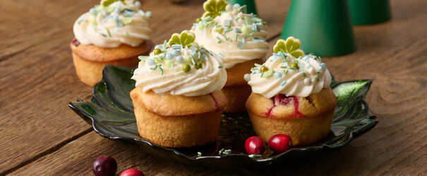 Sahne mit Sahnesteif und Vanillezucker steif schlagen. Sahne in einen Spritzbeutel mit großer Sterntülle füllen und auf den Muffins verteilen. Mit Zuckerstreusel dekorieren.
