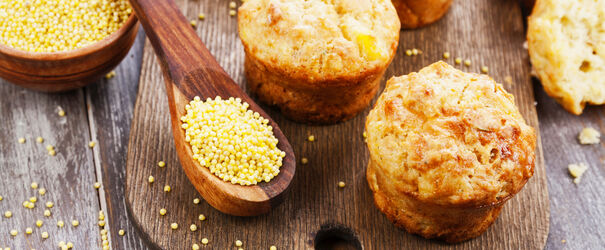Die feuchten Zutaten zu den trockenen Zutaten geben und vorsichtig verrühren. Die abgekühlte Hirse unterheben.