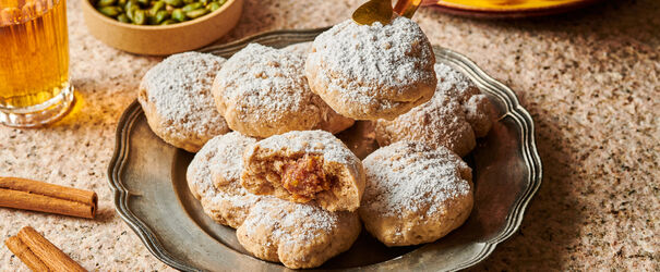 Im vorgeheizten Backofen bei 180 °C auf mittlerer Schiene etwa 15 Minuten backen, bis die Kahk leicht goldbraun sind. Auf dem Blech abkühlen lassen und vor dem Servieren mit Puderzucker bestreuen.