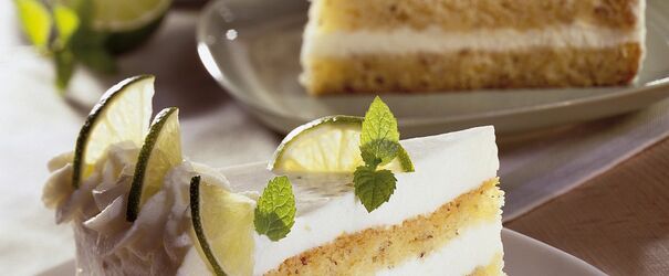 Für die Dekoration Sahne steif schlagen, Limetten in dünne Scheiben schneiden und halbieren. Die Oberfläche und die Seiten der Torte mit zwei Dritteln der Sahne bestreichen, mit der restlichen Sahne und Limettenscheiben verzieren.