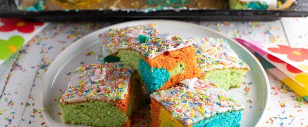 Ein tiefes Backblech oder eine Kuchenform eurer Wahl fetten und mehlen und anschließend die vier bunten Teige abwechselnd löffelweise in das Blech oder die Form geben, bis alle Farben aufgebraucht sind. Mit einem Holzstäbchen oder einer Gabel den Teig leicht durchmischen, um den Papageieneffekt zu erzeugen.