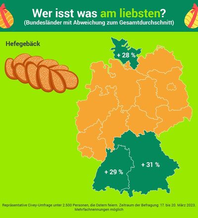 Hefegebäck wie Hefezopf oder Hefekranz werden hauptsächlich in Bayern (31 Prozent), Baden-Württemberg (29 Prozent), Schleswig-Holstein (28 Prozent) und Hessen (25 Prozent) gegessen.